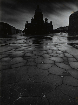 В этой фотографии монументальность Петербурга показана «снизу» — через асфальт, занимающий почти весь кадр. Низкая точка съёмки делает город тяжёлым и массивным: архитектура почти исчезает в сиянии дальнего света, что позволяет почувствовать бренность ленинградской земли.
