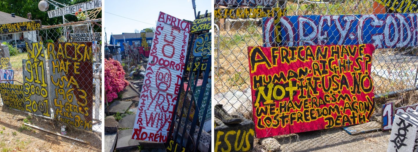 На фото одна из ключевых точек входа в его «деревню» — место, где сочетаются личные заявления, религиозные мотивы и историческая память. Все поверхности покрыты его характерными рукописными надписями жёлтой и белой краской. Среди них видны библейские цитаты, отсылки к афроамериканской истории («AUCTION AFRICA»), личные высказывания («MY DAD WAS A MAN»), политические призывы («PLEASE VOTE THIS TIME») и мотивационные фразы.