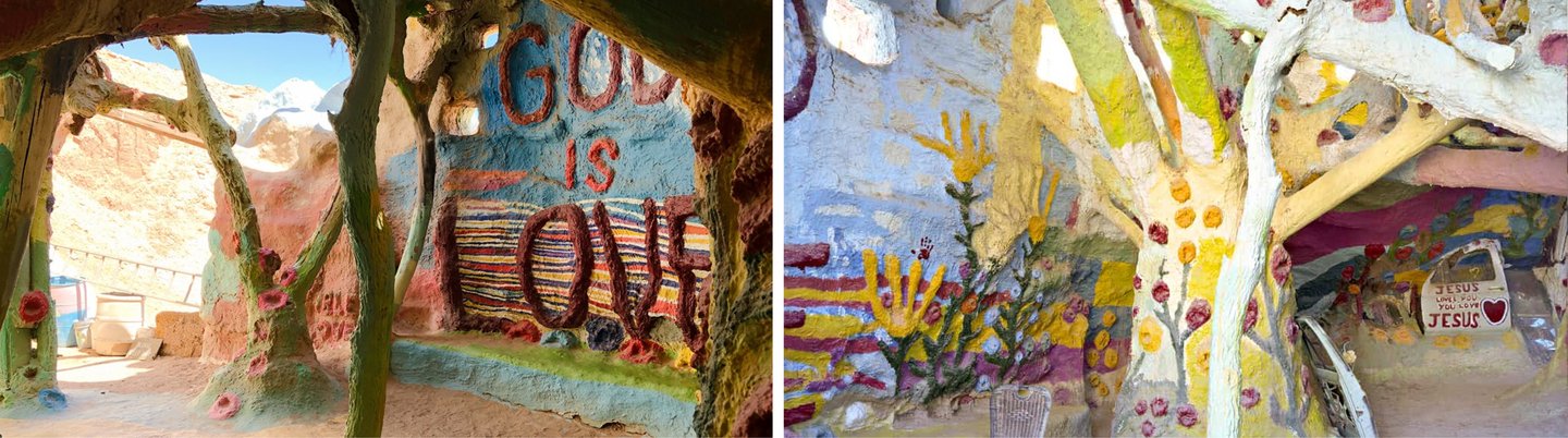 Внутренние пространства Salvation Mountain представляют собой систему пещер и залов, которые Леонард Найт вылепил из той же смеси глины, соломы и краски, что и внешнюю поверхность горы. На фотографиях видно, что эти интерьеры опираются на каркас из настоящих веток и стволов деревьев, окрашенных в яркие цвета — они служат несущими конструкциями и придают пространству вид сказочного леса. Стены покрыты рельефными надписями «God is Love», «Bible», «Jesus Loves You», которые выступают как барельеф и становятся частью архитектуры. В небольших световых проёмах и нишах Найт размещает миниатюрные таблички, сердечки и декоративные фрагменты — своего рода настенные иконы, вписанные в неровную поверхность.