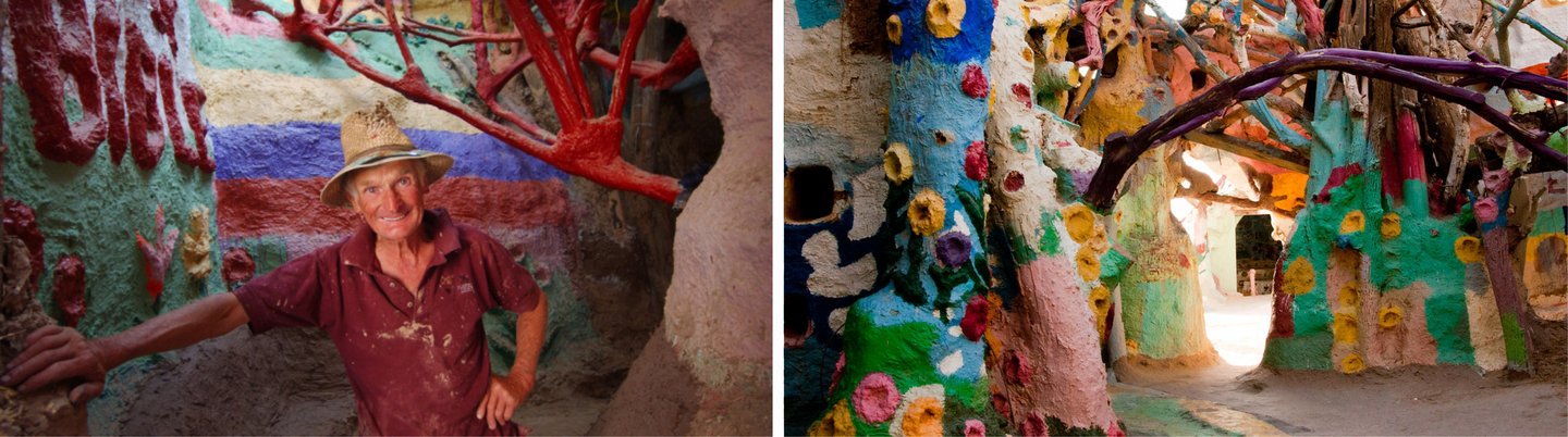 Третья важная линия — личная биография как основа проекта. Каждый из них строит не абстрактный арт-объект, а своё собственное пространство-манифест. Salvation Mountain — визуализация религиозного откровения Найта. African Village — история афроамериканской борьбы глазами Минтера. Bottle Village — архив жизни Присбри, собранный из вещей, которые она спасала от забвения. Paradise Garden — визуальная автобиография Фенстера, где каждая табличка фиксирует его мысли, страхи, откровения.