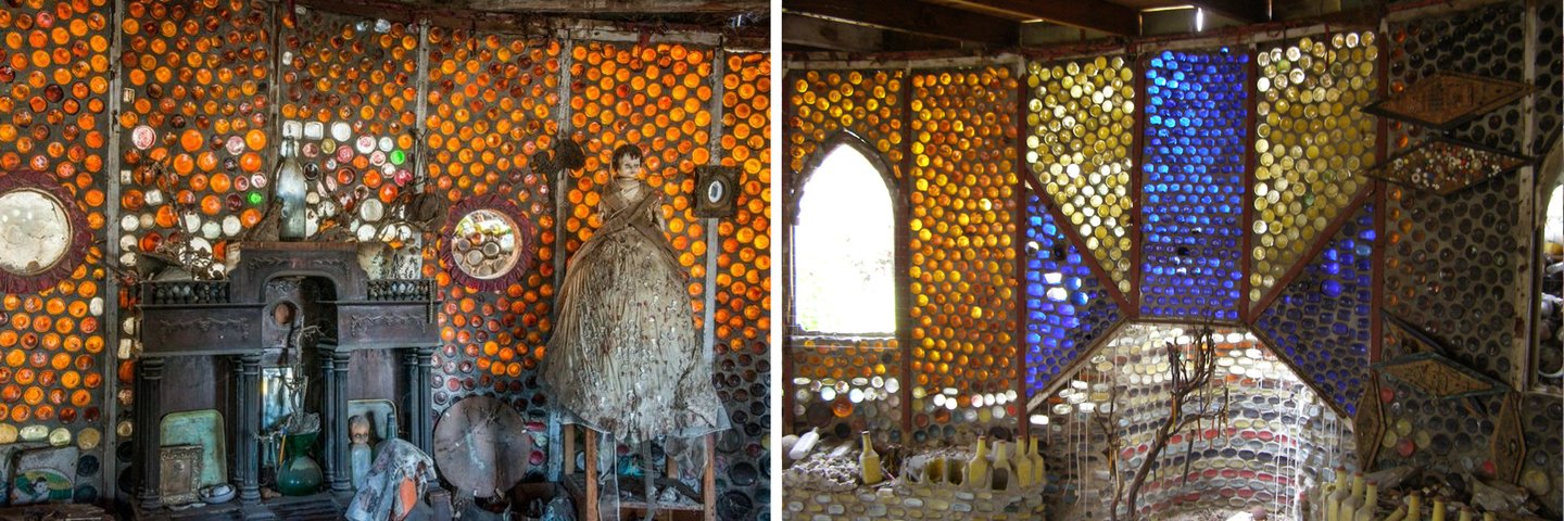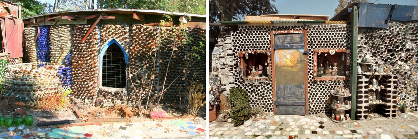 На этих снимках виден принцип, на котором построена вся Bottle Village: Трасси Присбри превращала доступный мусор — прежде всего стеклянные бутылки — в архитектуру и порядок.