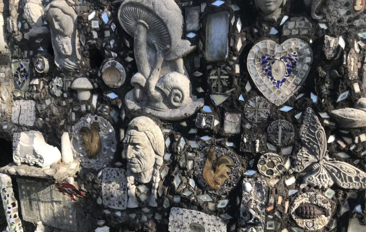 Эта стена представляет собой сложный рельеф из цемента, битого стекла, зеркальной мозаики, гипсовых голов, декоративных форм, старых предметов быта и найденных объектов.