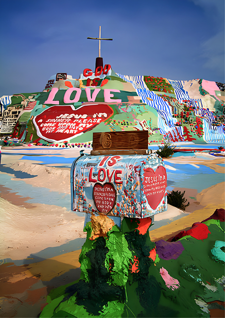Когда начинаешь изучать творчество Леонарда Найта, прежде всего поражает не масштаб его работы, а её упорство. В отличие от многих аутсайдеров, которые превращали в искусство собственный дом или двор, Найт выбрал место, где, казалось бы, ничего не могло возникнуть: пустынный участок возле Слаборского моря в Калифорнии, среди пыли, солнца и заброшенной техники. В изучении его творчества, важно понимать, что его проект не был ни художественной карьерой, ни поиском общественного признания. Он работал один, используя подручные материалы, краску, которую привозили добровольцы, и собственную физическую силу. Его гора росла десятилетиями, постоянно разрушаясь под воздействием солнца и ветра и снова восстанавливаясь его руками. Salvation Mountain — это одновременно скульптура, ландшафт, надпись и проповедь, в которой визуальная форма напрямую вырастает из личной веры Найта.