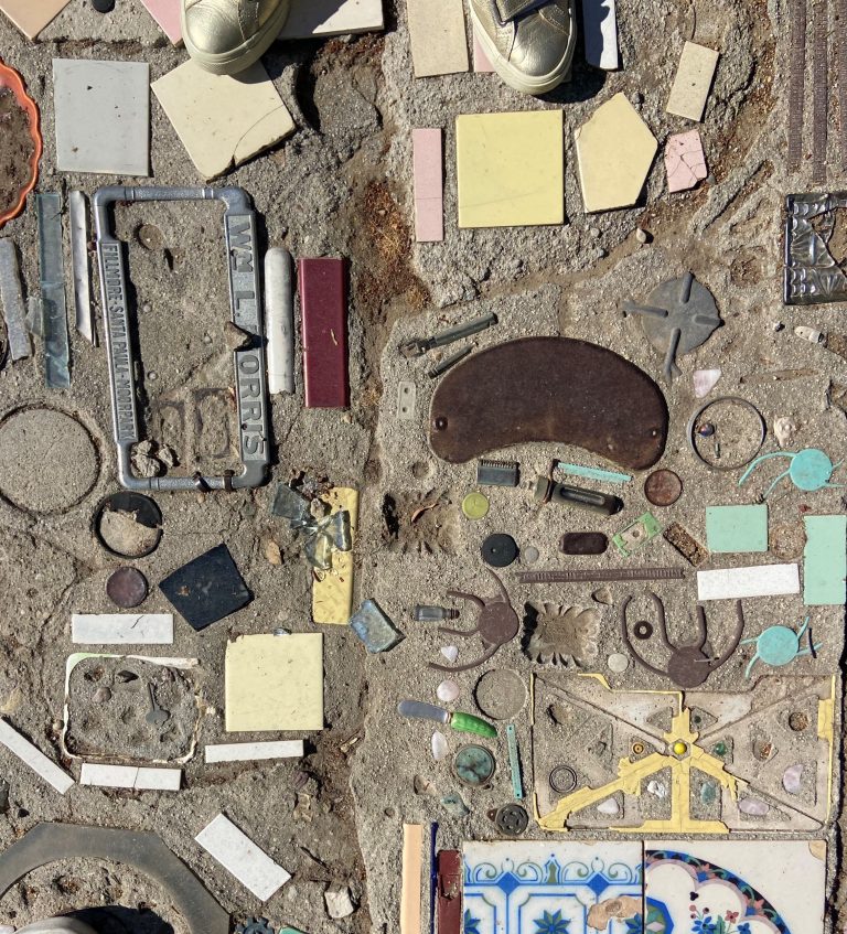Мозаичные дорожки в Bottle Village показывают рабочий метод Трасси Присбри: она использовала любые найденные материалы — осколки плитки, стекло, металлические детали, крышки, предметы быта — и встраивала их в цементную поверхность.