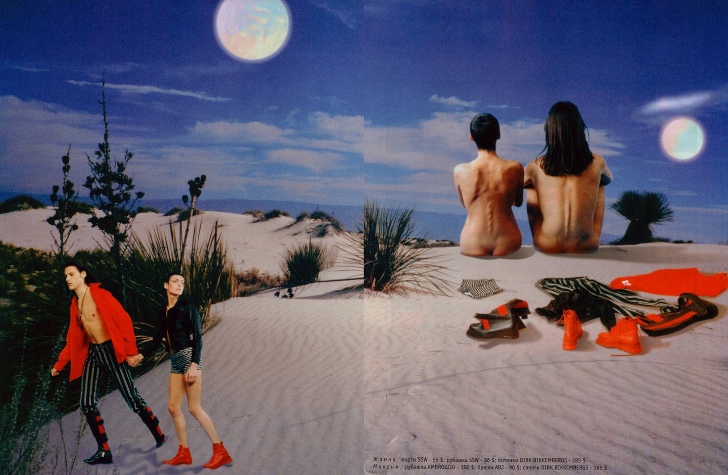 Отдельно стоит отметить формат рекламных съемок, которые создавались командой журнала для каждого отдельного рекламодателя. Несколько разворотов Naf Naf в новогоднем антураже, одежда из мультибрендового магазина «Маска» в пустыне, Big Star на крыше, Adidas в московском метро и Burton в ванной — авторы журнала вписывали одежду рекламодателей в контекст, близкий аудитории.