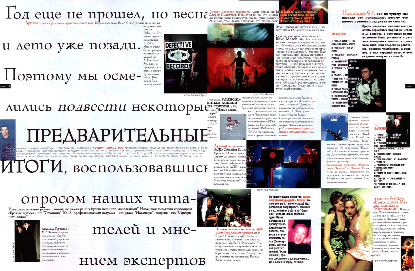 Ежегодные итоги журнала наравне с лучшими диджеями, промоутерами и лейблами в разные годы включали номинацию «лучший модельер», «лучший клубный дизайнер», «лучшее fashion show». Это говорит о том, что мода в то время уже была полноправной частью современной локальной культурной сцены, и сами авторы журнала делали многое для ее развития.