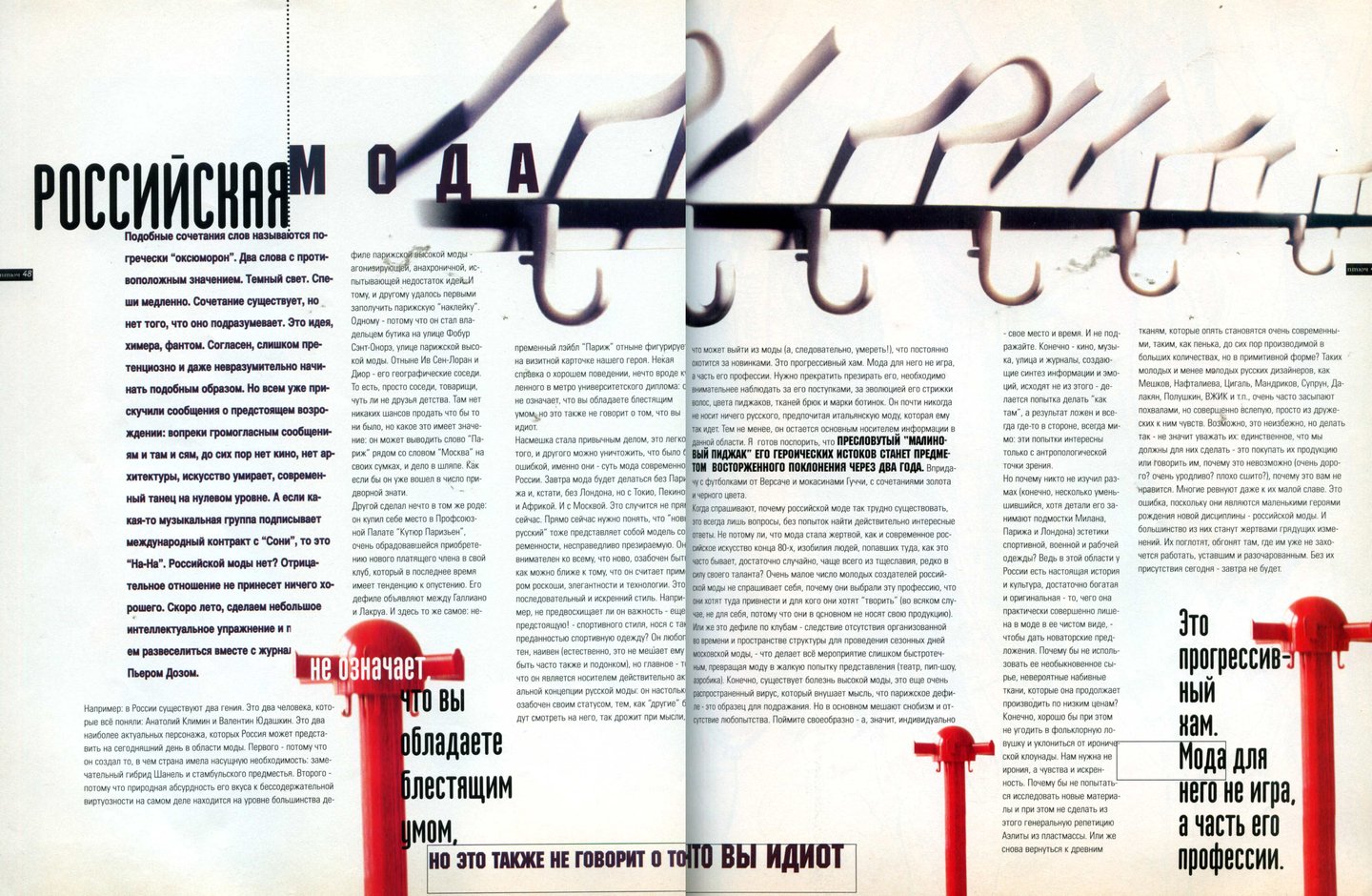 «Российская мода. Подобные сочетания слов называются по-гречески „оксюморон“. Два слова с противоположным значением. Темный свет. Спеши медленно. Сочетание существует, но нет того, что оно подразумевает. Это идея, химера, фантом. Согласен, слишком претенциозно и даже невразумительно начинать подобным образом. Но всем уже прискучили сообщения о предстоящем возрождении: вопреки громогласным сообщениям и там и сям, до сих пор нет кино, нет архитектуры, искусство умирает, современный танец на нулевом уровне. А если какая-то музыкальная группа подписывает международный контракт с „Сони“, то это „На-На“. Российской моды нет? Отрицательное отношение не принесет ничего хорошего. Скоро лето, сделаем небольшое интеллектуальное упражнение и попробуем развеселиться с журналистом Пьером Дозом.» — из майского номера 1998 года.