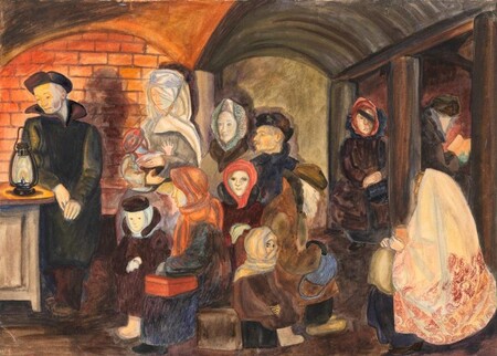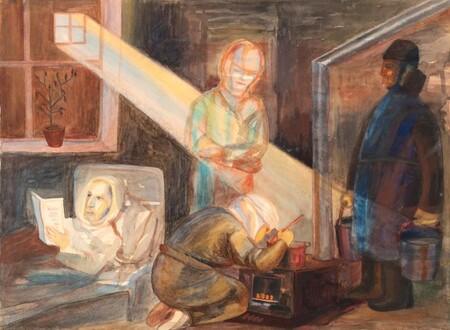 Глебова Татьяна «В Блокаду», 1942 г. Бумага, акварель. 31,6×44,4, Русский музей, https://rusmuseumvrm.ru/data/collections/drawings/rs-15103/index.php