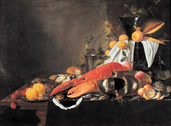Ян Давидс де Хем, Натюрморт с ветчиной, лобстером и вином, около 1653