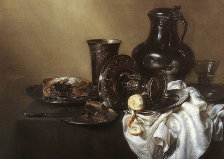 Виллем Клас Хеда достигает особой философской глубины через мотив распада, недосказанности и исчезновения формы: на первый взгляд пиршественные сцены оказываются пережитком момента насыщения. Вино пролито, пирог надломлен, ложка соскользнула с края блюда, ткань чуть смята. Вещи «живут» после события, когда человек покинул пространство. Здесь рождается особое ощущение пост-фактум, эстетика остатка, когда материальный мир существует сам по себе, без взгляда хозяина.