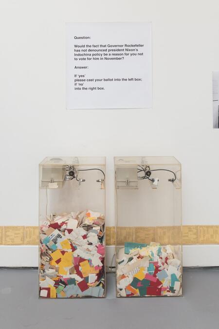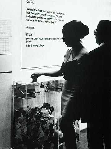Хааке вводил в стерильное пространство политические опросы и экономические данные. Он доказывал, что музеи управляются корпорациями и политиками. Белые стены не могут скрыть «грязные деньги».