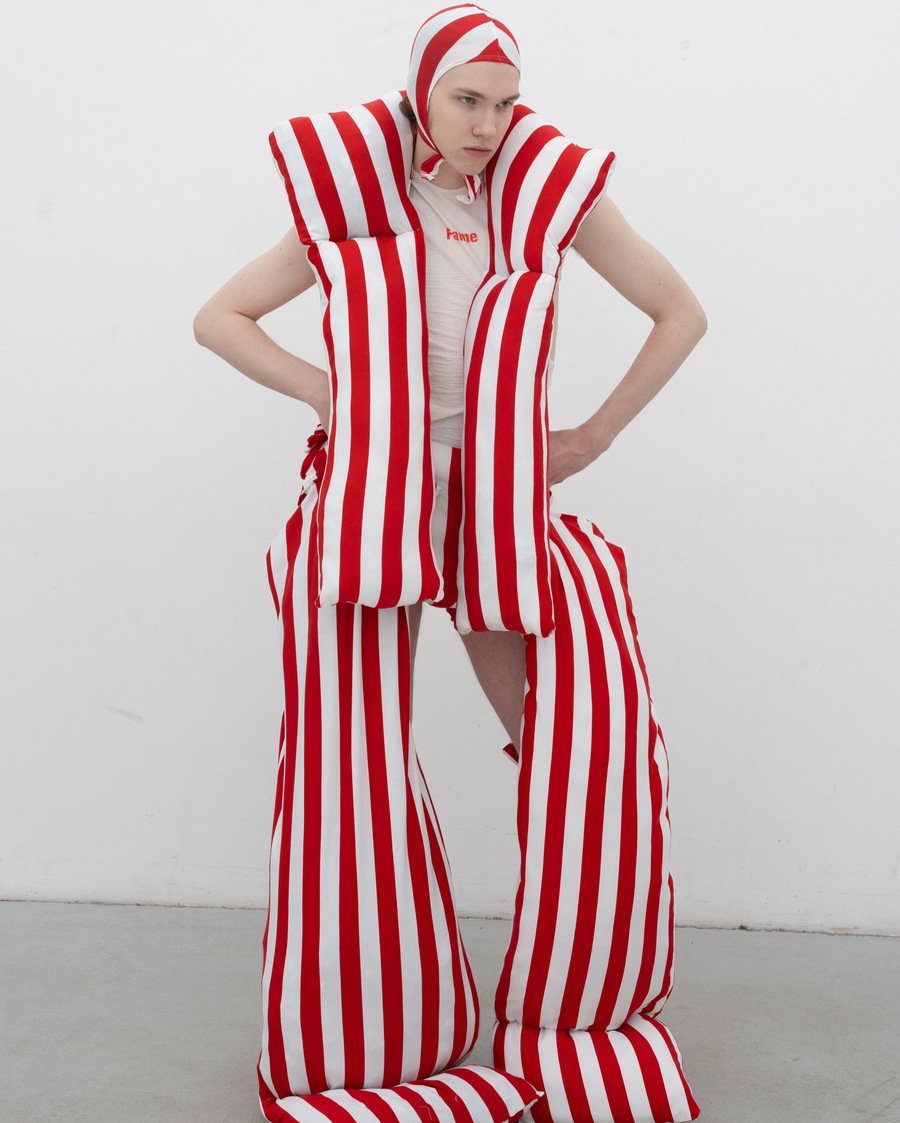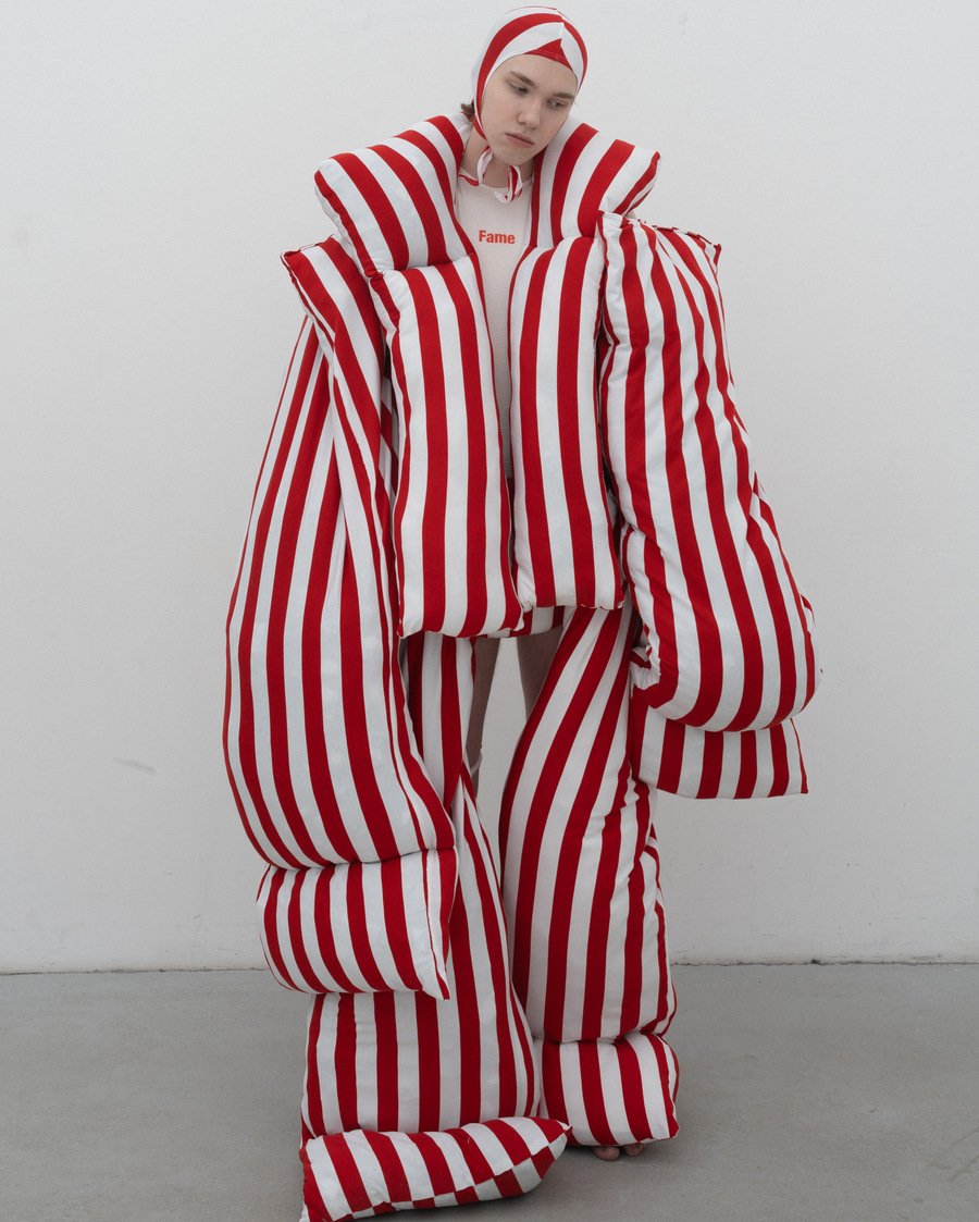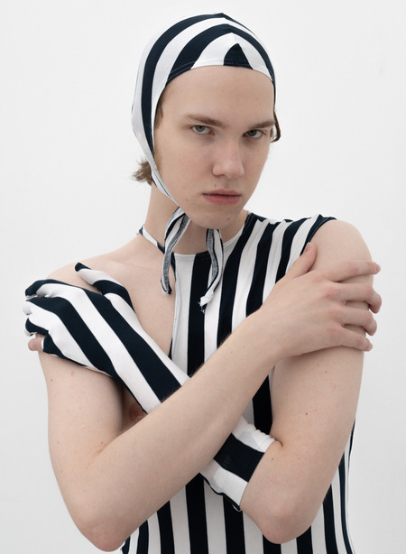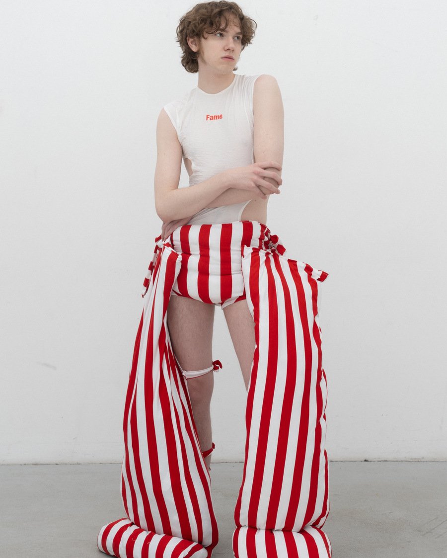 В прошлом модуле я изучал историю купального мужского костюма и историю Мэттью Уэбба, который ради общественного признания творил сумасшедшие поступки. К сожалению, последнее его безумство закончилось его смертью. Анализирую эту историю, я заметил параллель с современным миром — люди продолжают совершать различные безумства, чтобы получить заветные лайки и репосты в социальных сетях. Изучая различные образы знаменитостей, я пришел к выводу, что основными способами провокации являются гротескное оголение или масштабирование образа. В своем проекте я работаю через призму купальной эстетики, гипертрофируя принадлежности для плавания и ретро-купальники.