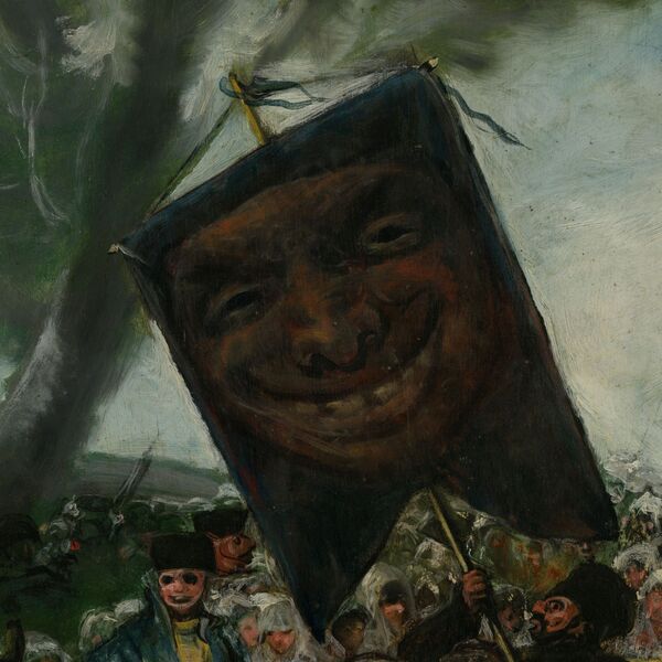 Если официальное искусство прославляло монархию, то Гойя в «Похоронах сардинки» показывает её будущих могильщиков — народную толпу. Эта работа знаменует собой и резкую трансформацию его стиля: от парадной ясности к мрачному гротеску, где реальность искажается в духе карнавального безумия. За фасадом всеобщего веселья скрывается коллективный хаос: жуткие маски, деформированные лица и знамя с ликом смерти наполняют сцену тревогой. Отныне Гойя— не придворный художник, а летописец надвигающегося хаоса. Именно это социальное напряжение и выплеснется наружy с началом наполеоновских войн.