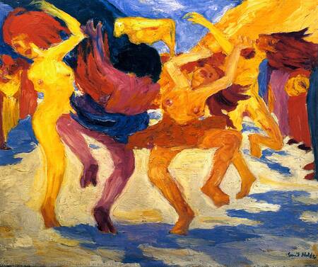 Слева — Эдвард Мунк, «Танец жизни», 1899-1900. Справа — Эмиль Нольде, «Пляска вокруг золотого тельца», 1910.
