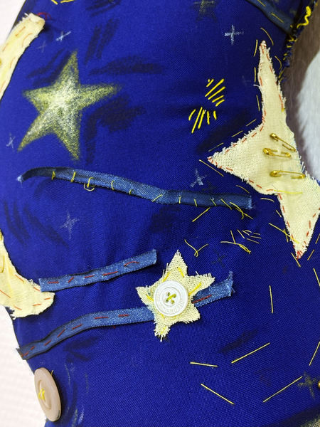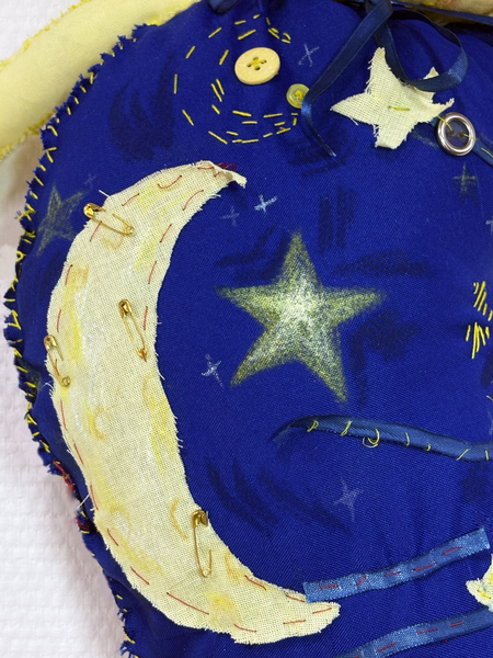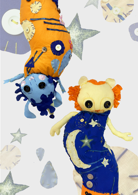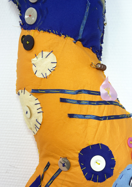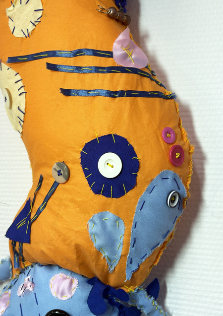 Форма игрушки нарочито неаккуратная и наивная, будто ее сшил ребенок из подручных материалов и случайных кусков ткани. Эта наивность отражает чистоту детского мышления, когда образы в голове еще не ограничивает взрослая реальность. Линии и узоры смелы и кривоваты, но очаровательны.