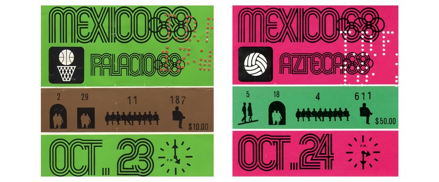 Шрифт системы строится на принципе параллельных линий, напрямую продолжающих волнообразный паттерн логотипа. Каждая буква — это не декоративный элемент, а структурная единица: вертикальные линии в «M», «E», «X» отсылают к узорам уичолей, горизонтальные в «I», «C», «O» создают оп-артовскую вибрацию, а цифры «68» интегрированы в слово «Mexico» как часть единого ритма. Такой подход позволил шрифту работать на разных масштабах: от микроскопических надписей на билетах до монументальных букв на фасадах стадионов высотой до двух метров. «Мы не создавали новый шрифт — мы вытянули его из логотипа», — подчёркивал Эдуардо Терразас.