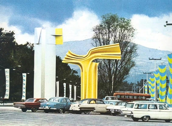 Проект Ruta de la Amistad стал кульминацией этой идеи. По 17-километровой кольцевой дороге установили 22 монументальные скульптуры, созданные художниками из 19 стран. Каждая — абстрактная, геометрическая, с радиальными формами и яркими цветами — продолжала визуальный язык бренда. «Солнечные ворота» Матиаса Гёритца у стадиона Azteca: чёрная конструкция с красным кругом и радиальными линиями на площади в синем и белом. «Мексика» Педро Фридеберга у Олимпийского стадиона: жёлтая Y-образная арка на фоне белых колонн. Скульптуры не стояли изолированно — они связывали пространство. Зритель, едущий по кольцевой, видел: линия ведёт к цвету, цвет — к следующей форме. Город стал динамичной галереей, где искусство было частью дорожной инфраструктуры.