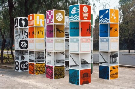 Система была полностью интегрирована в городскую среду. В неё входили 22 монументальные скульптуры Ruta de la Amistad, 12 станций метро с олимпийскими пиктограммами, 10 000 единиц униформы гидов, более 5000 уличных указателей, 300 км цветовых линий на дорогах и в подземке, а также 1,2 миллиона билетов с цветовой кодировкой. Всё работало как единая сеть. Даже сувениры — монеты, пепельницы, значки — несли тот же визуальный код, превращая повседневность в продолжение системы.