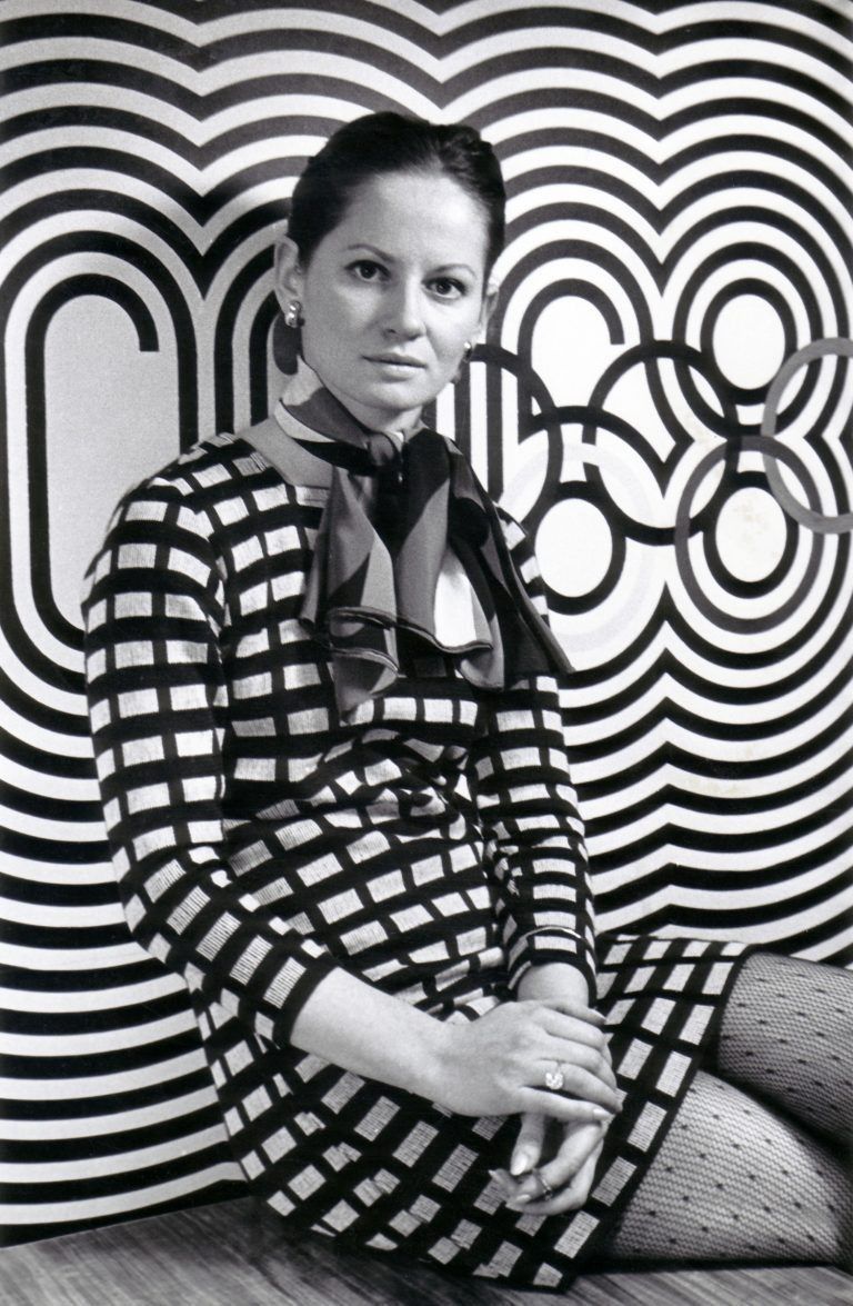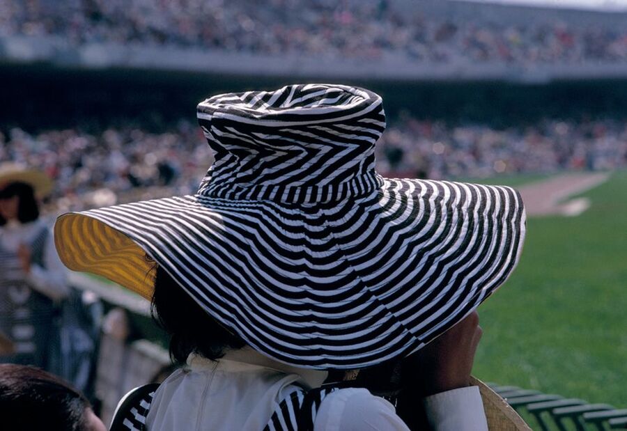 Оп-арт шляпа зрителя и промо-модель в радиальном платье, Мехико, 1968