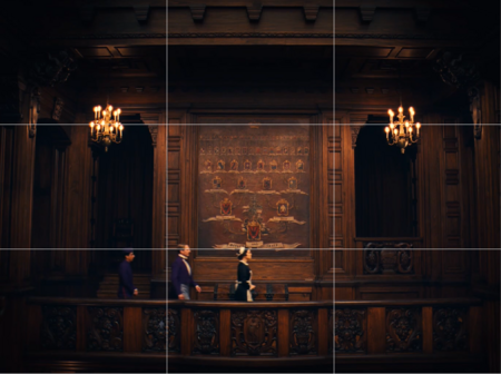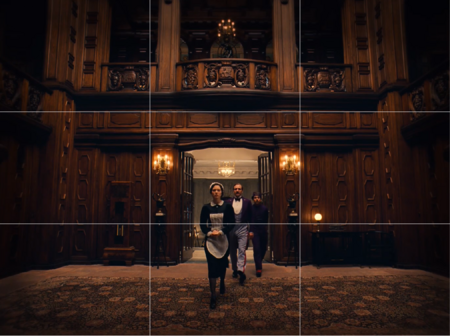 В представленных выше кадрах, персонажи (горничная и сопровождающие ее Зеро и Месье Густав) кажутся относительно маленькими по сравнению с высотой потолков, огромными дверными проемами и богатым убранством дома. Вертикальные линии деревянных панелей, колонн и арок создают ощущение огромного, почти бесконечного пространства. Богато украшенный ковер на полу также подчеркивает роскошь и масштаб интерьера, по сравнению с которым, персонажи кажутся незначительными и даже второстепенными героями. Ведь главным героем здесь становится само пространство.