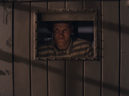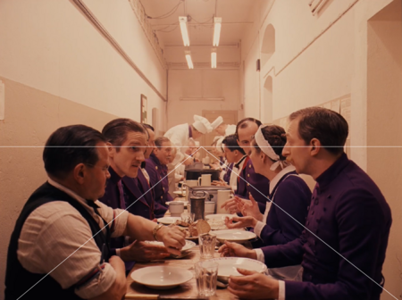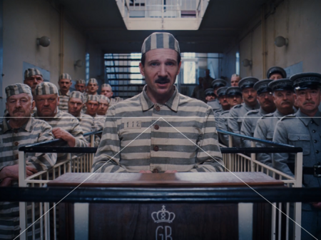 На первом кадре сужающаяся перспектива акцентирует глубину пространства и направляет взгляд зрителя вглубь кадра, но акцент остается на лицах персонала, сидящих за столом. На втором же кадре акцент смещается на Месье Густава. Так, в зависимости от контекста, такая перспектива может создавать ощущение погружения и вовлеченности или же угнетения и контроля, как в кадре с тюрьмой.