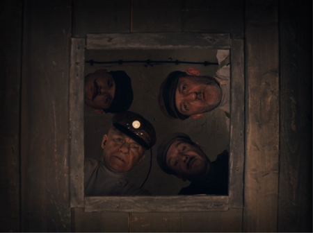 В данном примере мы можем наблюдать, как на первом кадре вертикальные линии стен лифта и тел персонажей создают чувство замкнутости и формальности, в то время как на втором- горизонтальные линии полок, кроватей создают тесноту, ограниченность пространства и подчеркивают схожесть персонажей.