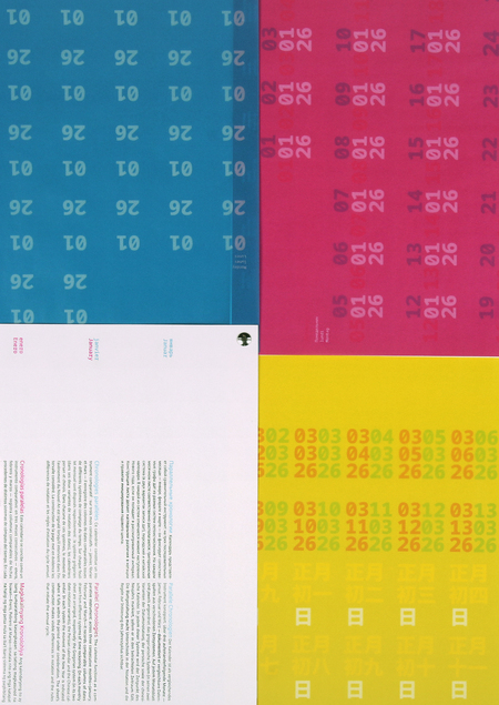 Серия из четырех календарей обращается к вопросам восприятия и репрезентации времени в разных языковых и культурных традициях. Каждый из проектов показывает, что привычные нам формы переживания времени не универсальны, а зависят от способов их выражения.