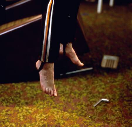 Лиминальность усиливается эпизодами, где фигура человека внезапно «взмывает» в воздух, нарушая физическую логику пространства. Эта левитация создаёт краткое сомнение в документальности увиденного и подчёркивает пористость архитектуры: коридоры бывшего учреждения оказываются не просто помещениями, а зоной, где прошлое и настоящее, реальное и призрачное сосуществуют в одном визуальном поле. Такие моменты превращают пространство в состояние постоянной неуверенности — то ли мы наблюдаем материальные следы репрессивной системы, то ли сталкиваемся с её фантомом.