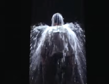 «Океан без берегов» развивает эту стратегию через прямое визуальное воплощение порога — завесу падающей воды. Здесь пространство разделено на два мира: неясное серое пространство «по ту сторону» и мир зрителя «по эту». Завеса работает как пограничная мембрана: переход через неё меняет не только физическое качество изображения (от монохромной бесформенности к яркой материальности), но и саму природу пространства. Тело, выходящее из-за водной границы, как будто входит в зону жизни, а возвращаясь обратно — покидает её. Лиминальное пространство становится здесь механизмом, через который визуализируется переход между бытием и небытованием.