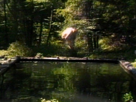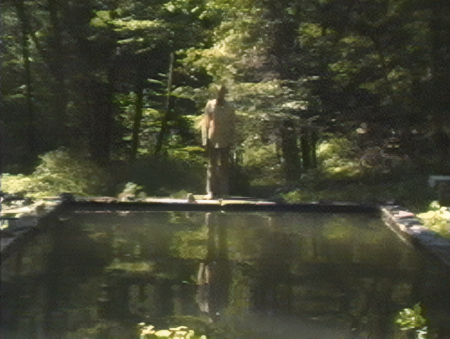 В противоположность архитектурно принудительным инсталляциям «Отражающий пруд» выстраивает лиминальность через поэтику остановленного времени и разрыв привычной причинности. Одноканальное видео помещает зрителя перед лесным прудом, где человек, появившись из-за деревьев, совершает прыжок. В этот момент привычная кинематика разрушается. Тело застывает в воздухе, лишаясь своей физической логики, тогда как поверхность воды продолжает жить собственной жизнью: рябь, световые сдвиги, исчезающие фигуры проявляются именно в отражении, а не в «реальном» пространстве кадра. Визуальный акцент переносится на плоскость воды — как на зону, в которой возможно то, что запрещено законами физики.