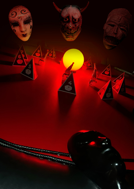 Игроки выкладывают карты-тоннели, строя путь к сокровищу. Саботеры тайно мешают, ломая дорогу. Здесь нет ведущего: коллектив сам управляет циклом подозрения и обвинения. Тоннели и лампы создают пространство вечной темноты — визуальный аналог «ночи» ритуала.