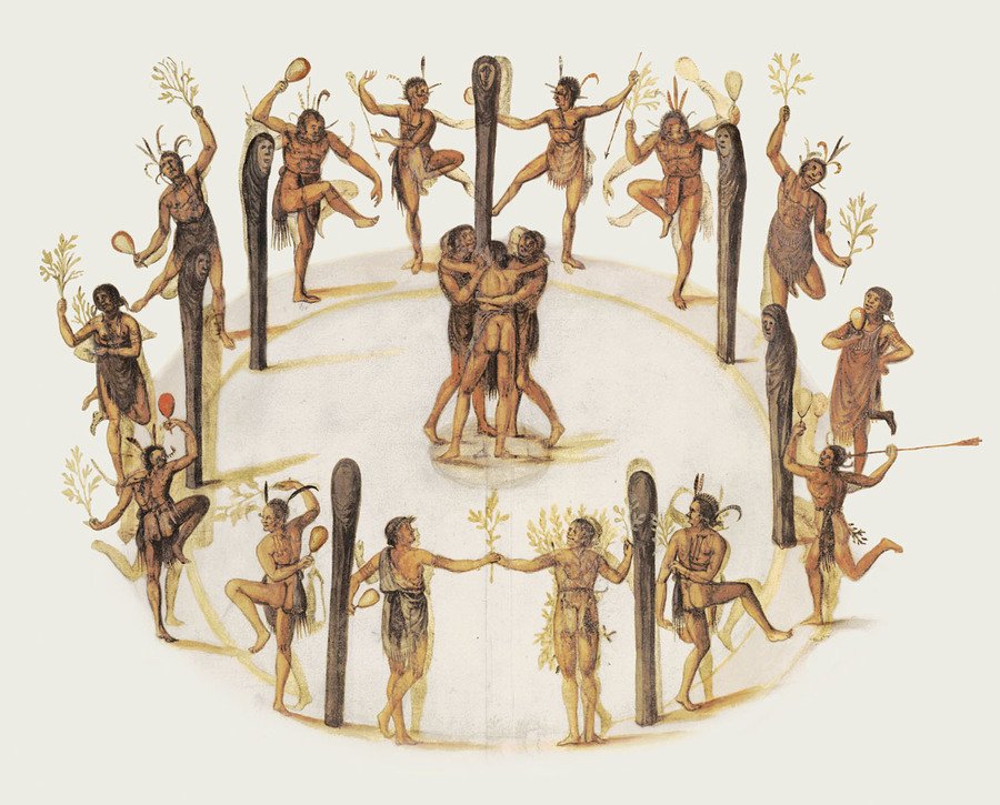 Танцующие Индейцы-повхатаны с острова Роанок и Индиец и индийка едят- известные картины художника и мореплавателя Джона Вайта, написанные в 1580х годах.