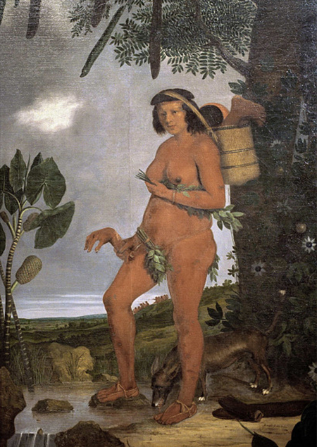 Первые изображения аборигенов Америки в 16-17 веке–– имели описательный характер, главной целью большинства гравюр было задокументировать важные исторические события или показать новую, дикую, непонятную европейцам культуру и необычных дикарей, которые с удовольствием позировали для рисунков и охотно показывали свои одеяния, видя любопытство со стороны колонизаторов и рассчитывая на их благие намерения. Хоть и гравюры и картины того времени не отличались художественными сюжетами, в многих из них можно увидеть подтекст, индейцы — дикари, безбожники, людоеды, отстающие в развитии. Такой образ аборигенов формировался под влиянием рассказов путешественников, миссионеров и колонизаторов и часто использовался как оправдание колониальных амбиций Европы.