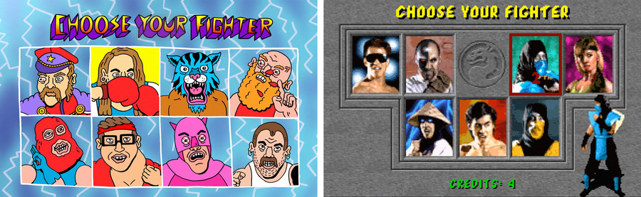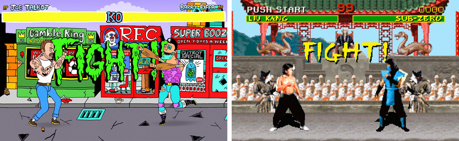 1. Кадр из клипа Never Fight A Man With A Perm — IDLES (реж. Аль Браун, 2019) 2. Mortal Kombat (1992)