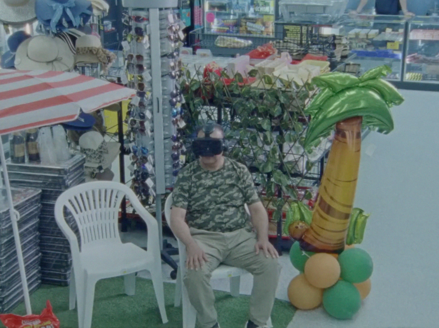 Посетитель магазина из клипа Gift horse — IDLES перемещается в онлайн симулятор жизни. Ирония над простыми способами избежать реальности и проблем.