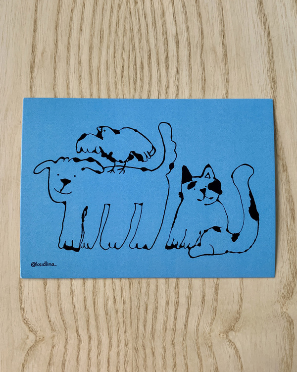 Открытка формата А6 с собачкой, котом и птицей — тремя друзьями, которым никогда не бывает скучно.