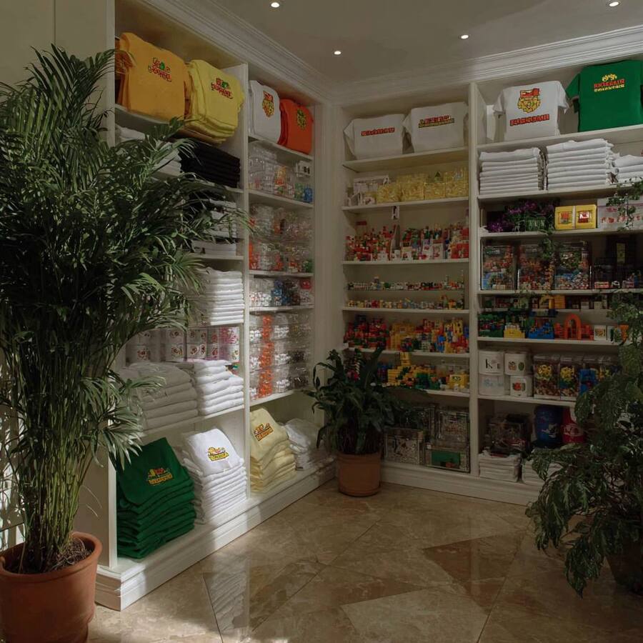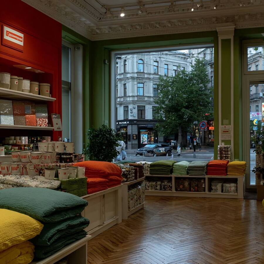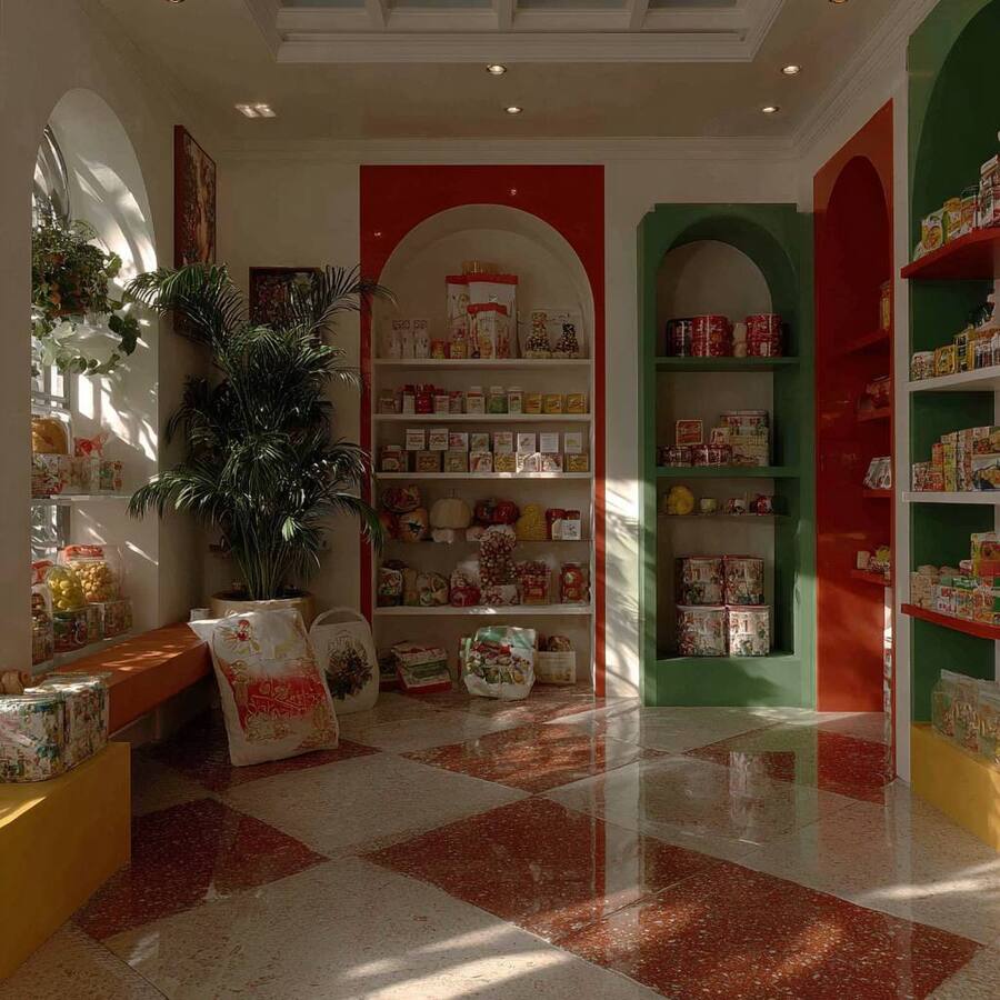 A modern store interior for «Suetin Park», designed in the style of Nikolai Suetin and Russian Suprematism. The space is filled with abstract geometric shapes — circles, squares, and lines — in a harmonious composition, with dominant red, black, and white colors. Shelves and displays showcase park merchandise, including T-shirts, mugs, posters, and small souvenirs, all featuring Suprematist designs.