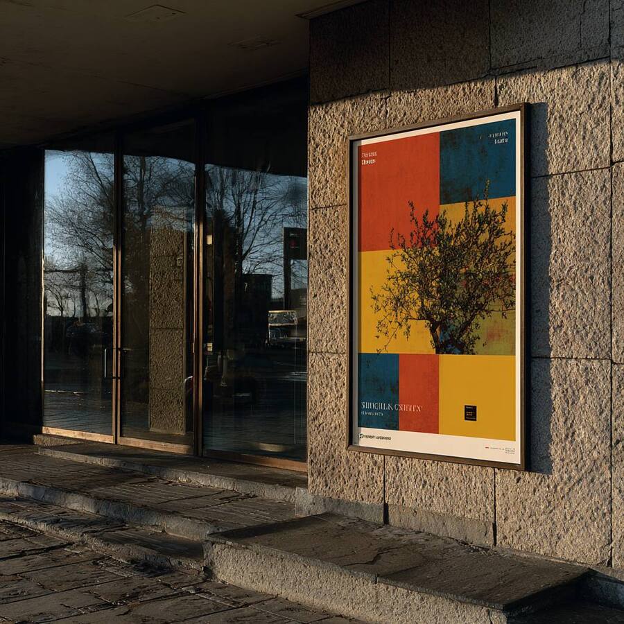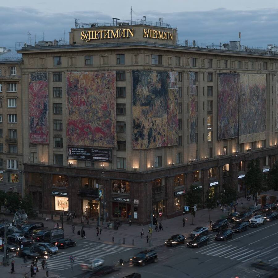 Promt: create minimalistic advertising posters for Nikolai Suetin’s park called «Suetin’s park» using orange, yellow, and red colors. The posters suprematism style. They are on the building and the name Nikolai Suetin is written there in large letters