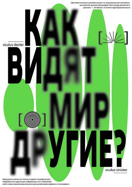 «Ты совсем ничего не видишь без линз? Без очков у тебя все двоится? Дашь их примерить?», — многие люди с нарушениями зрения сталкиваются с такими вопросами. Некоторые из них вызваны не только заинтересованностью, но и незнанием и неосведомленностью об особенностях других. В своем плакате я постаралась не только отразить специфику клиники «Зрение», но и объединить разные комьюнити: людей с нарушениями зрения и без, специалистов и пациентов. Чем больше мы узнаем об особенностях других, тем больше мы помогаем им интегрироваться в общество. Нарушения зрения не только создают специфические потребности в адаптации информации, но и позволяют найти новые креативные решения для дизайнеров графики и типографики. Узнаваемые элементы: звезда и «лучистая фигура» Сименса, OS и OD, — в симбиозе с графическими элементами из логотипа клиники создают «говорящий» дизайн. Плакат помогает понять, как качество и острота зрения влияют на взаимодействие с объектами дизайна, как по-разному видят мир люди с нарушениями зрения.