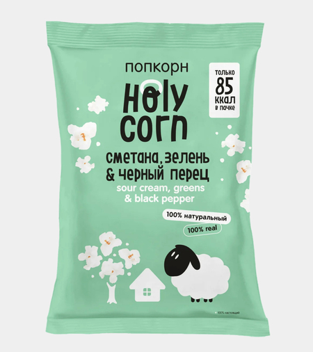 Важно отметить, что Holy Corn продуктовый бренд, поэтому важно показать сам продукт, чтобы покупатель захотел его съесть. Попкорн вписан в композицию упаковки, в некоторых случаях из него даже вырисовываются простые образы, как дерево на упаковке попкорна со сметаной, зеленью и черным перцем.