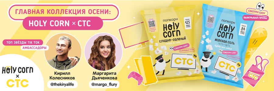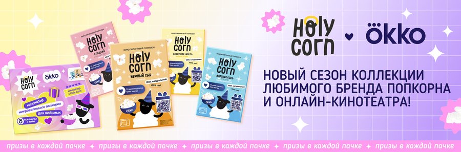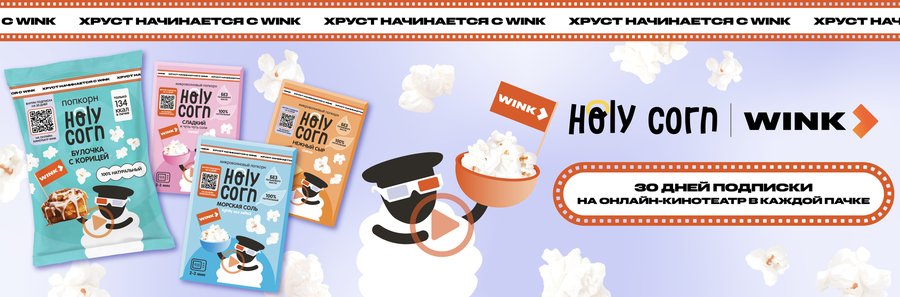 Бренду снеков не обойтись без коллаборации с сервисами для просмотра фильмов, это логично и поддерживает суть продуктов. Holy Corn удалось поработать со многими: Wink, Okko, СТС.
