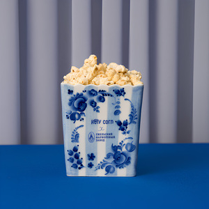 Одна из самых последних и трендовых коллабораций — это Holy Corn x Гжельский фарфоровый завод. Сейчас во многих творческих сферах переосмылсяются русские традиции и орнаменты, это вызывает теплые воспоминания у русского народа, а также кажется невероятно современным и модным. Holy Corn следует традициям и выпускает лимитированную серию попкорна с двумя необычными вкусами — лесные грибы и шарлотка, что навевает воспоминания о чем-то домашнем и детском. Помимо этого, кастомную упаковку помогают сделать сами мастера Гжельского фарфорового завода, орнаменты которых дорабатываются под минималистичный язык бренда. Приятным бонусом является керамический стаканчик для попкорна, который можно приобрести отдельно. Он расписан вручную работниками Гжельского завода, этот сувенир и вся рекламная компания соединяют культуры двух поколений — молодежный попкорн и исторически ценное ремесло, что приносит популярность обоим организаторам акции.