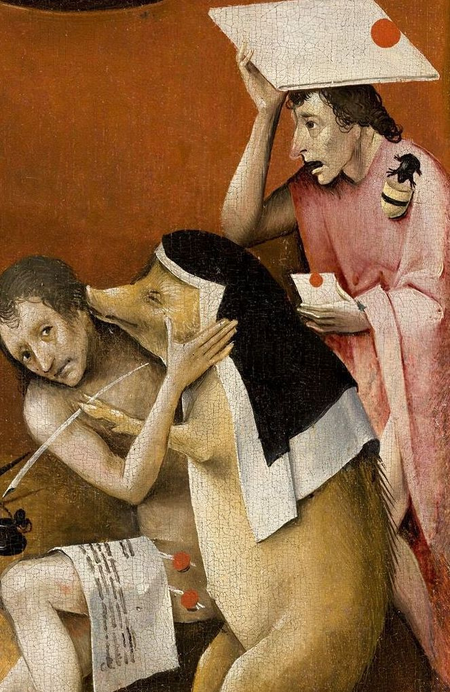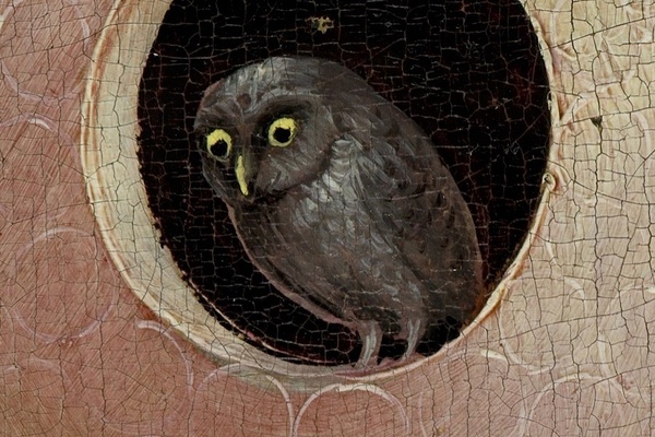 Однако в сюжете, где господствует хаос и сладострастие, Босх все равно изображает единственный образ, которого не коснулось распутство и чревоугодие, единственный «чистый и светлый» персонаж — Бог. На той же створке можно рассмотреть четкий образ совы — символ духовной слепоты и ереси, в которых и погрязло человечество. В центральной части композиции есть изображение полого дерева в форме перевернутой воронке — олицетворение ада, безверия. Красный цвет намекает на кардинальское платье, Босх прямо намекает на то, что католичество слепо погрязло в мирских пороках, жадности и вере, основанной на подписанных бумажках.