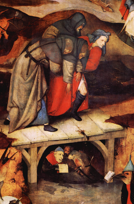 Триптихи Босха, бесспорно, служили источником вдохновения для Брейгеля. В них мы наблюдаем такое же множество демонических существ, небесные и человеческие образы, полные бесплотности и отображающие грехи человека, пороки, в которых погрязло общество без Бога.