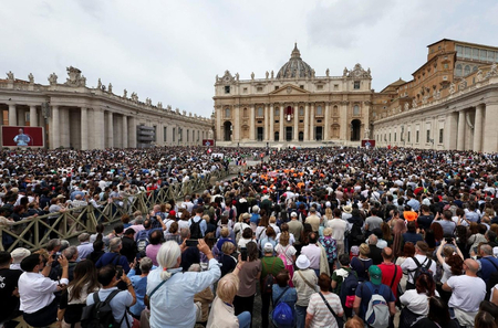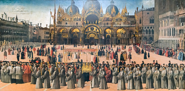 1. Паломники на площади Святого Петра (11 мая 2025 г.) из статьи Vatican News. 2) Джентиле Беллини. Процессия на площади Святого Марка. 1496 год.