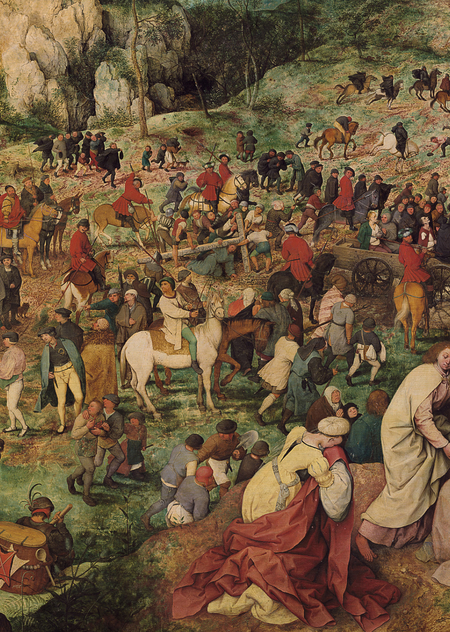 Фигура Христа будто теряется в огромном скоплении человеческих фигур и сюжетов. Даже сравнивая с работой Мемлинга «Страсти Христовы» можно провести параллель: в момент зарождения общественного неодобрения действий и раскола церкви образ Христа можно легко найти на картинах, в эпоху Брейгеля же в середине XVI века автор акцентирует внимание на толпе, как на образе человечества и его жизненном пути, Христос либо трудно заметен, либо проявляется в общем смысле картины.