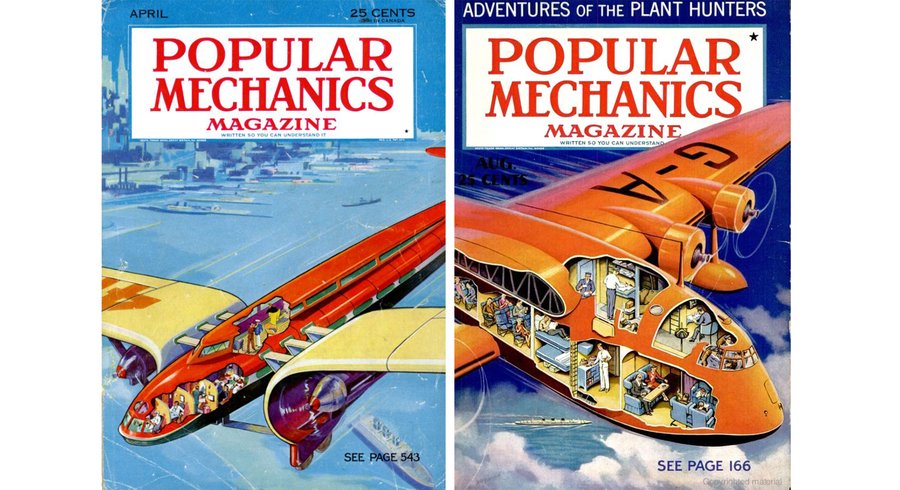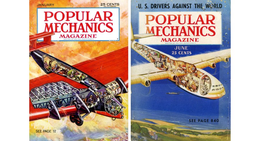 В это же время на обложках журнала «Популярная механика» красуются сверхзвуковые и коммерческие самолеты, ориентированные на удобство и практичность, новые модели военных самолетов, вертолетов и прочих летательных аппаратов.