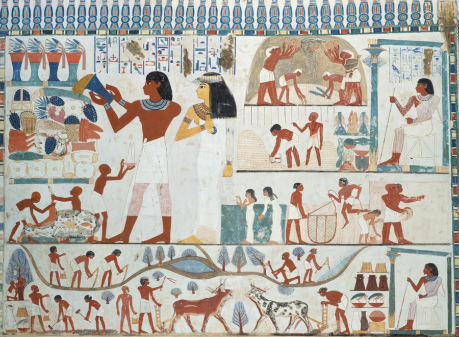 Нахт и его жена Тави, гробница Нахт, около 1400-1350 гг. до н. э.; Ловля птиц и полевые работы (фрагмент), гробница Итет, около 2700 г. до н. э.