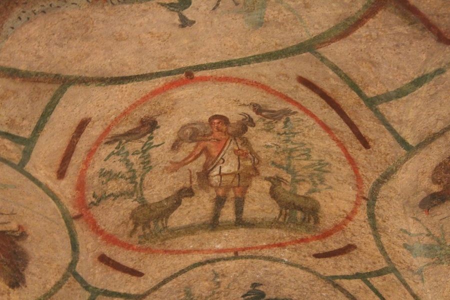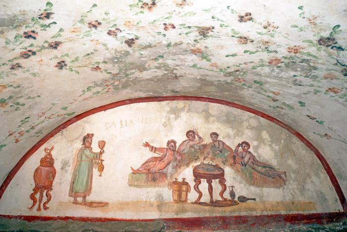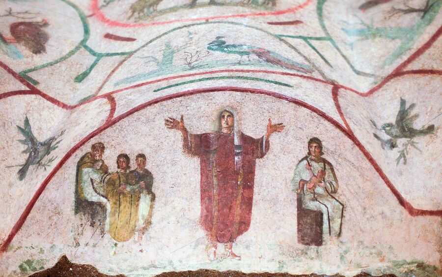 Росписи катакомб II века н. э. свидетельствуют о том, что пространство уступает место силуэту, линии и сюжету. Изображение становится символом запечатления действия.
