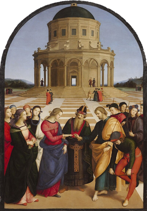 Мадонна в гроте, Леонардо да Винчи, 1483–1486 гг.; Обручение Девы Марии, Рафаэль Санти, 1504 г.
